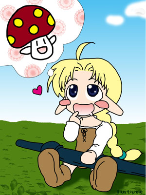 | 容姿】エルフの平均身長・華奢な体型。少々色の薄い金髪、白色系肌、濃い藍の瞳。 経歴】「臨死体験したことがある」「旅をしたことがない」「大好きな食べ物がある」 ===================================== 自宅がある森では、たくさんのキノコが生えている。 彼女はキノコが大好きで、見かけると食べてしまう。 ――例え毒があったとしても。 そんな訳で、臨死体験をした(何) |